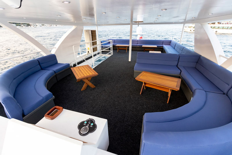 - Facilities: Kitchen, shower, bar, sunbathing area with cushions, dance floor.